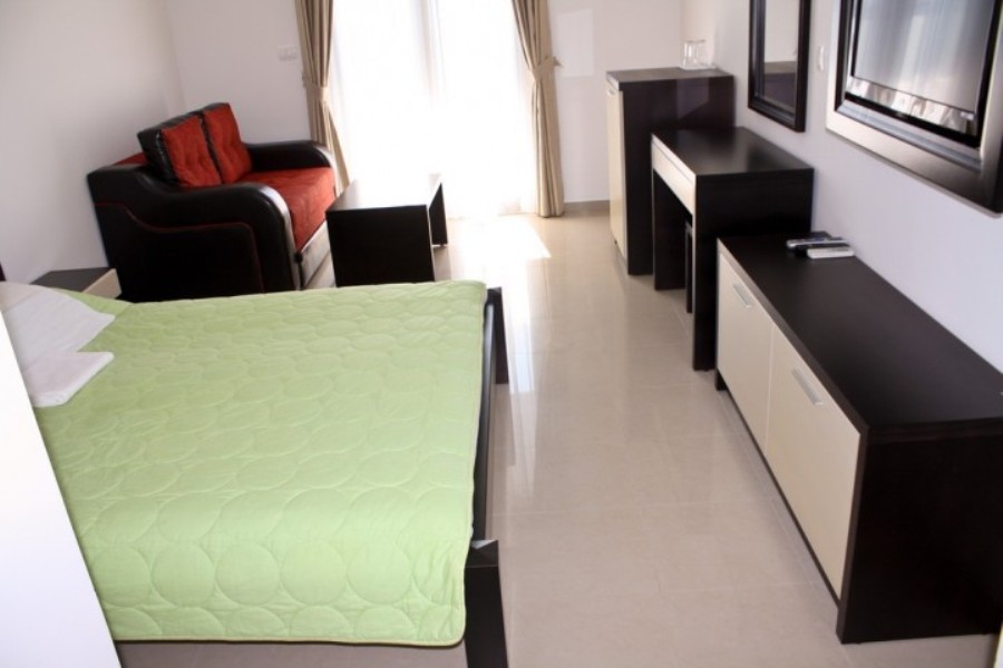 Studio 03 superior sv (№16,17,21,22,23): 24 м2, терраса 4-6 м2 с прямым видом на море, французская кровать (160x200cm) + раскладной диван (120×200cm), мини-кухня (комплект посуды, электрический чайник, варочная панель), ванная комната с душем. Максимальное размещение — 3 человека.