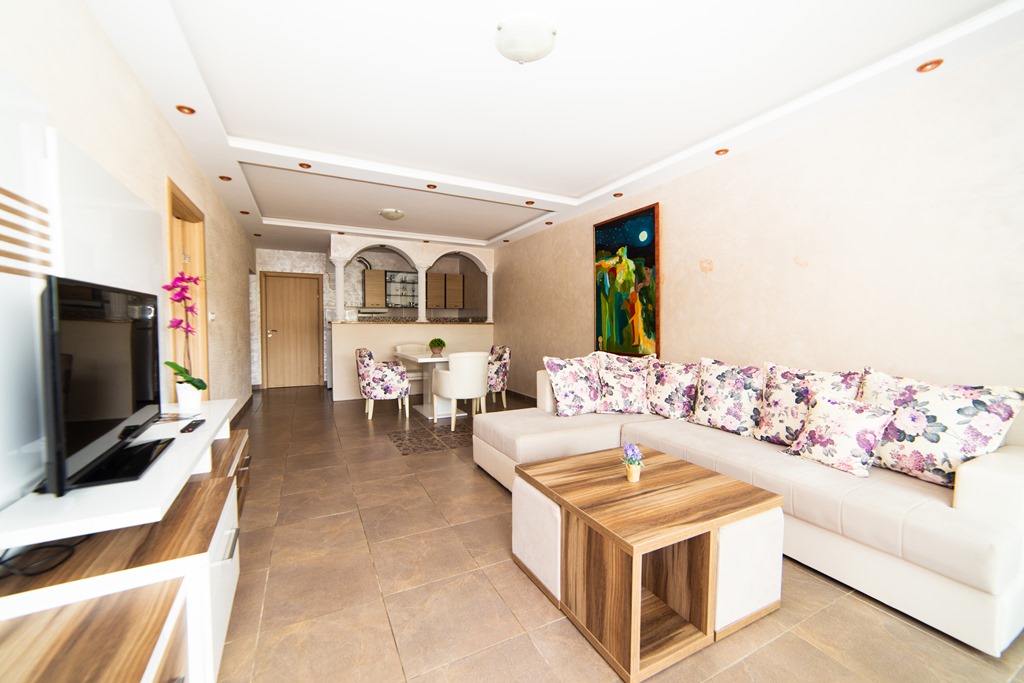 В АРР 3 BR: у вітальні розкладний диван та два крісла, обладнана кухня, три спальні з роздільними ліжками, три кондиціонери, супутникове ТБ, праска, санвузол з душовою кабіною, пральна машина, тераса з видом на море. Площа: 90 м2. Максимальне розміщення: 6 чол.