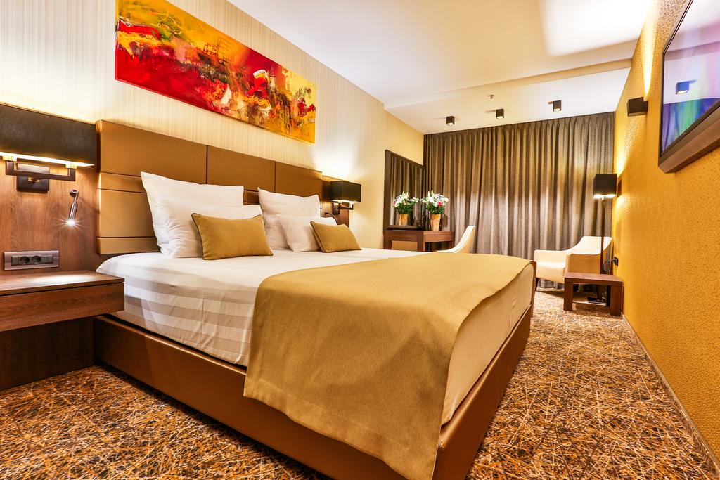 В Deluxe DBL SV: французьке ліжко та софа, зона відпочинку, кондиціонер, супутникове ТБ, Wi Fi інтернет, міні бар, сейф, телефон, апарат для приготування чаю та кави, чайник, санвузол з душовою кабіною, фен, капці, балкон з видом на море. Максимальне розміщення: 2+1 чол. Площа: 35 м2.