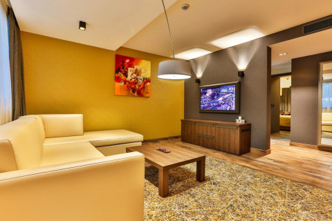 В Superior Suite SV: вітальня з розкладним диваном, софа, повністю обладнана кухня, столова зона та зона відпочинку, у спальні французьке ліжко, кондиціонер, супутникове ТБ, Wi Fi інтернет, міні бар, сейф, телефон, апарат для приготування чаю та кави, чайник, санвузол з душовою кабіною, фен, капці, балкон з видом на море. Максимальне розміщення: 4+1 чол. Площа: 90 м2.