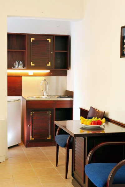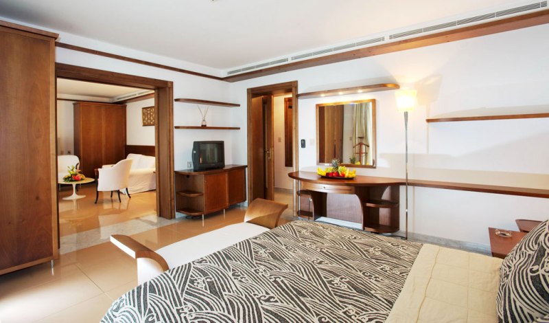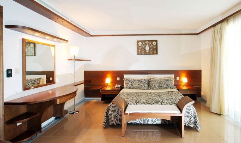 DELUXE № 101, 102, 103: Розміщення 2 pax. У кімнаті 2 роздільні ліжка. Телевізор, міні - бар, сейф, кондиціонер. Вихід на загальну терасу над басейном. У ванній - душ, фен. (44 м2).