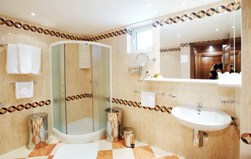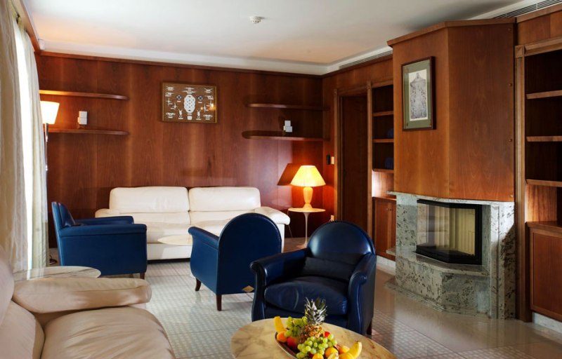 JUNIOR SUITE № 104: Розміщення 2+1 pax. Передпокій, вітальня та спальня. У салоні двомісний диван з кріслами, журнальний столик, міні-бар, телевізор, телефон, кондиціонер, сейф. Вихід на загальні тераси. У спальні двоспальне ліжко, телефон, телевізор, міні - бар. Вихід на загальну терасу. Дві ванні кімнати. У ваннах - душова кабіна. (57 м2).