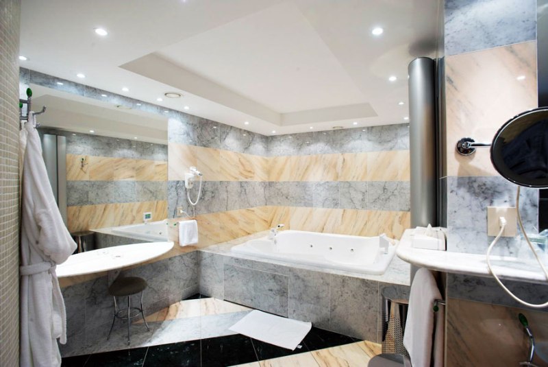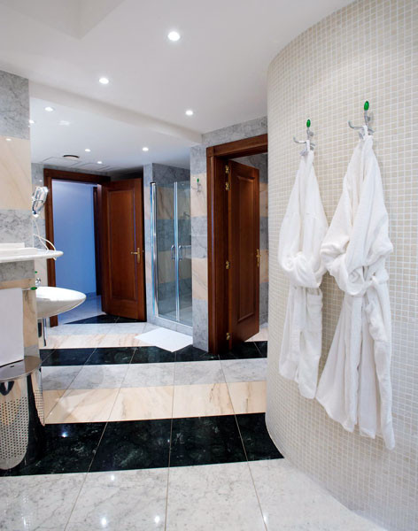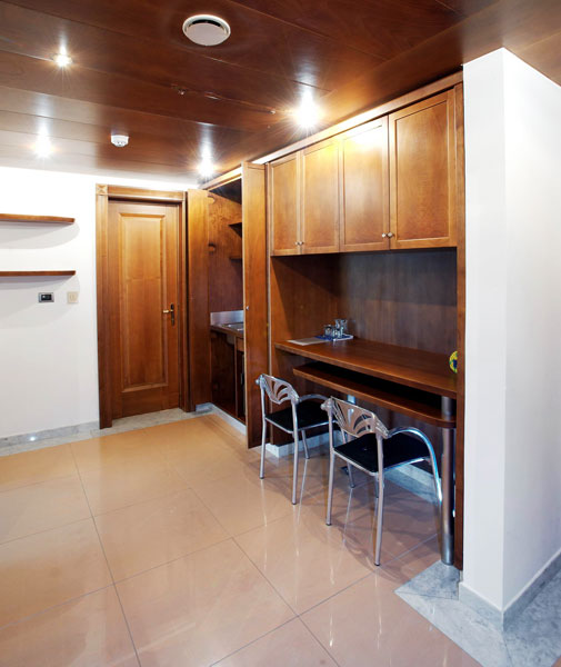 ROYAL SUITE №105: Розміщення 4 pax. Передпокій, кухня, велика вітальня, дві спальні. Вхід а апартамент з коридору або ліфта, за допомогою кодової електронної карти. Повністю обладнана кухня. На стіні плазма екран і сураунд система CDі видио. Вихід на власну терасу, яка розташована уздовж всього апартаменти. У великій спальні двоспальне ліжко 2000 x1700, плазма екран і сураунд система з відео і CD, сейф, телефон і вихід на терасу. У меншій спальні ліжко 2000 х 1700, телевізор з DVD, телефон і велике вікно, без виходу на терасу. В апартаментах 2 ванні кімнати і туалет. Велика ванна кімната з джакузі. (156 м2).