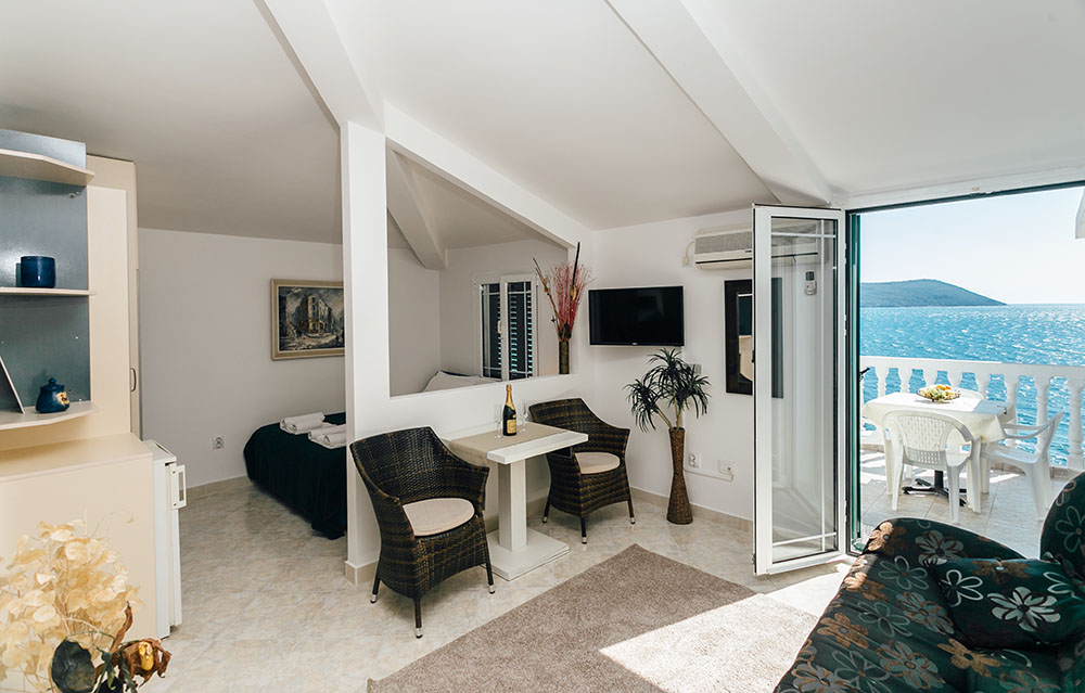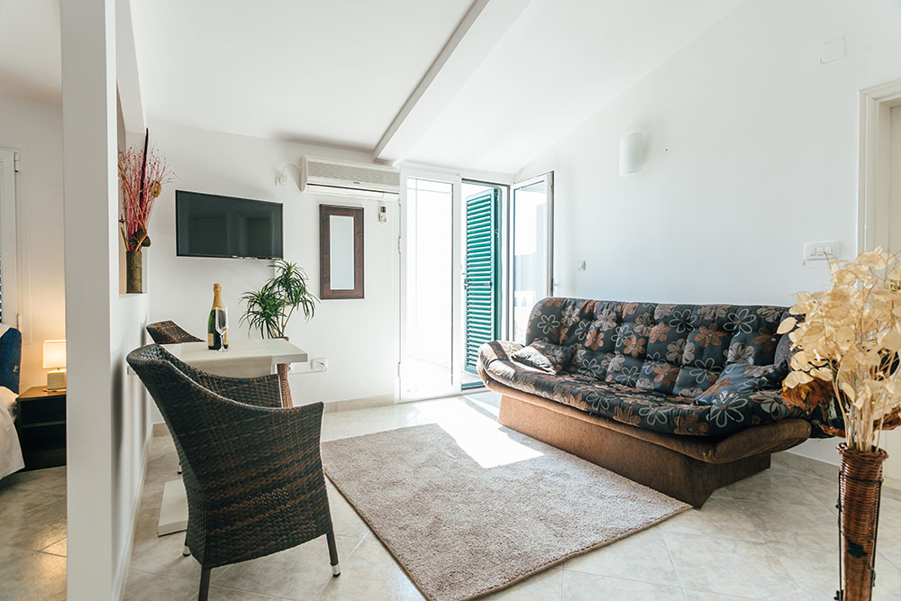 В APP 04 SV: вітальня з диваном, в спальні французьке ліжко, повністю обладнана кухня, кондиціонер, кабельне ТБ, Wi Fi інтернет, санвузол з душовою кабіною, балкон з видом на море. Площа: 45м2. Максимальне розміщення: 4 чол.