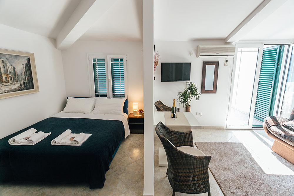 В APP 04: вітальня з диваном, в спальні французьке ліжко, повністю обладнана кухня, кондиціонер, кабельне ТБ, Wi Fi інтернет, санвузол з душовою кабіною, балкон. Площа: 45м2. Максимальне розміщення: 4 чол.