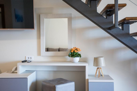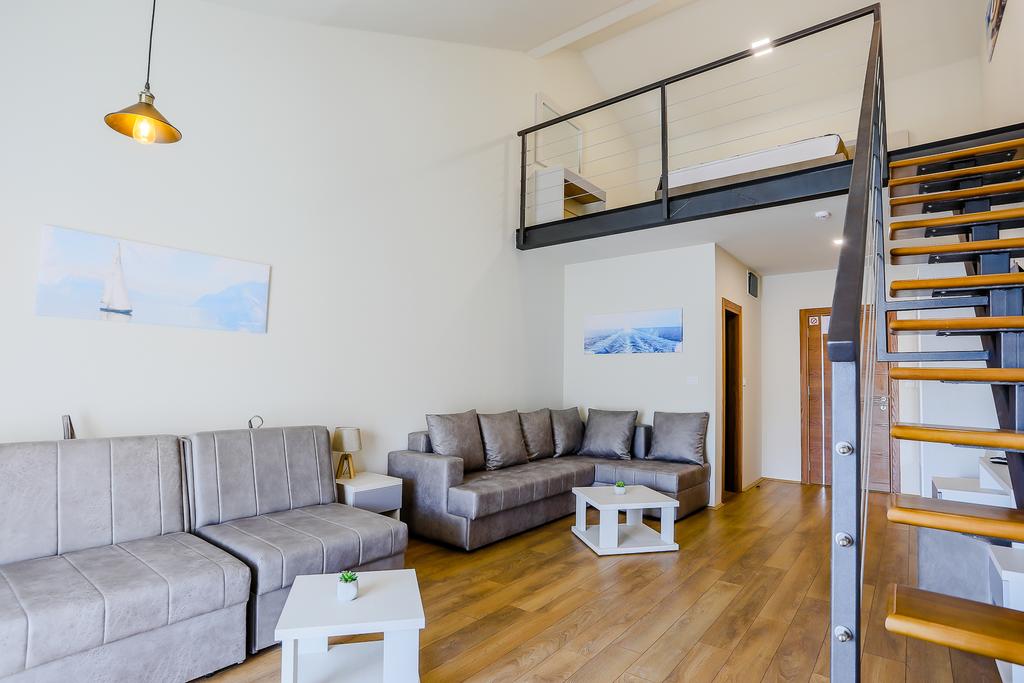 В STUD 02-04: дворівневий номер - дуплекс, на верхньому рівні французьке ліжко, на нижньому рівні розкладний диван та крісло, кондиціонер, супутникове ТБ, WI FI інтернет, міні бар, санвузол з душовою кабіною, балкон з видом на море. Максимальне розміщення: 2 дор + 3 дит.