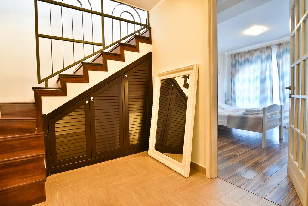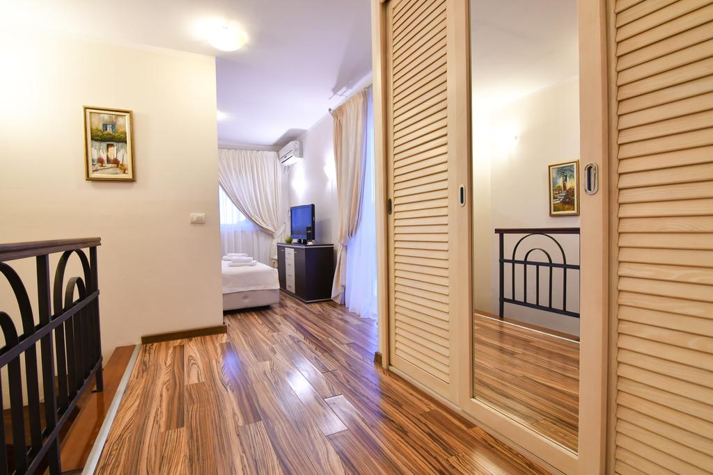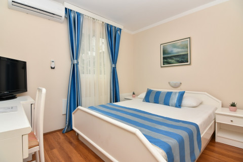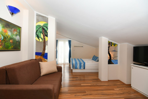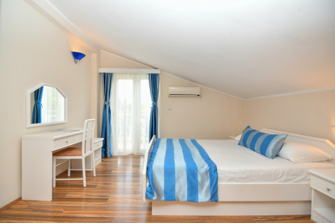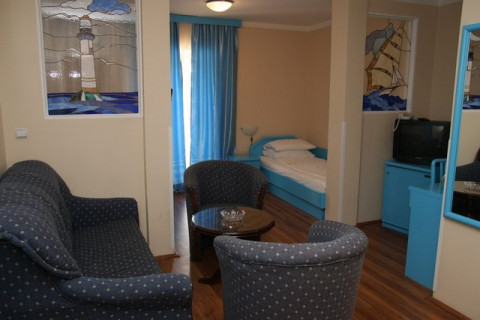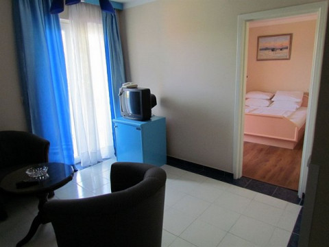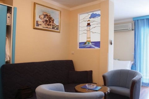 B DELUX SUITE: зонірованниє номера, в вітальні зоні розкладний диван, в спальній зоні французьке ліжко. Всі номери мають балкон з видом на море, кондиціонер, кухонний блок, міні-бар, 2 телевізори, радіо, телефон, фен, сейф, санвузол з душовою кабіною. Максимальне розміщення: 4 чол. Площа: 65 м2.