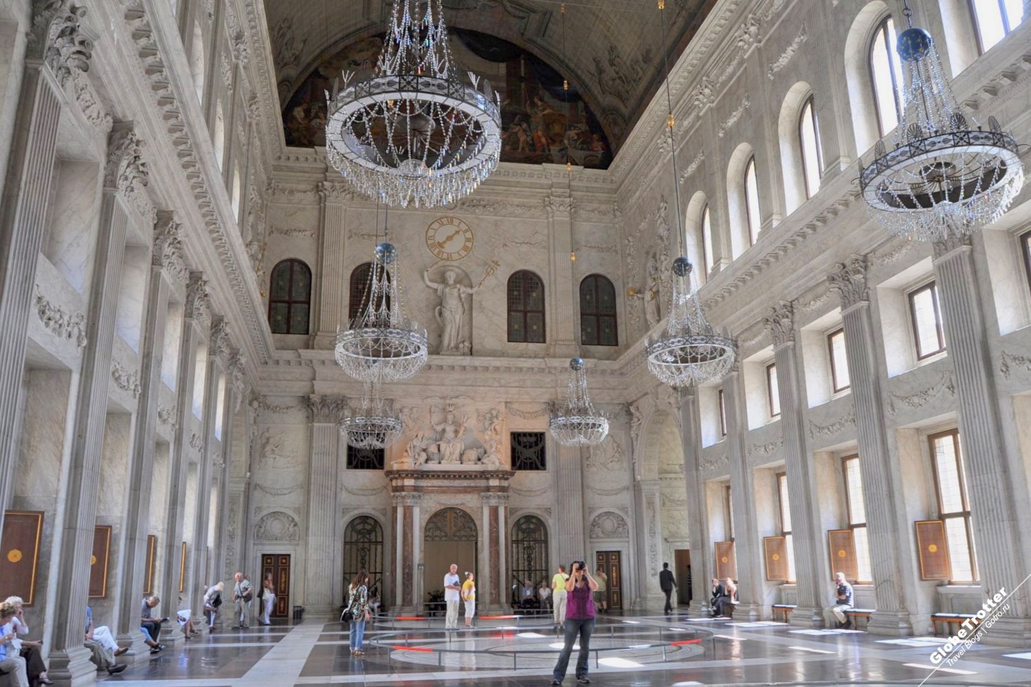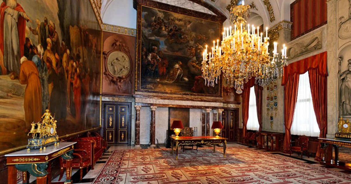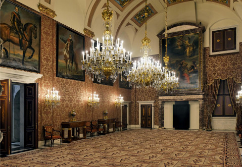 Всі внутрішні приміщення відрізняються багатим оздобленням - обробка мармуром і золотом вражає своєю розкішшю. Інтер'єр доповнює старовинны антикварні меблі в хитромудро-чудернацькому стилі ампір, масивні люстри з кришталю і полотна відомих голландських живописців.