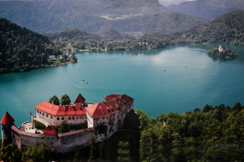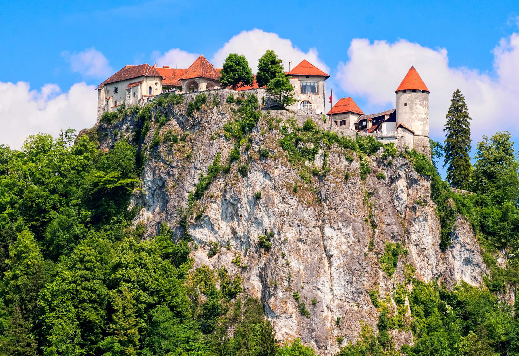 Кращий вид на озеро з островом і намистом альпійських вершин навколо нього відкривається з замку на скелі. Цей красивий замок вважається одним з найпопулярніших місць для весільних церемоній в Європі; протягом довгого часу він був також місцем важливих дипломатичних подій і протокольних зустрічей. У замку XII століття вас чекають цікава архітектура, колекція музею, середньовічна друкарня, в якій ви дізнаєтеся про традиційну ручного друку, льох замку, де ви можете наповнити пляшку вина і запечатати її сургучем, замкова кузня і ресторан. У літню пору ви можете зустріти тут вельмож і лицарів або взяти участь в турнірі лучників.