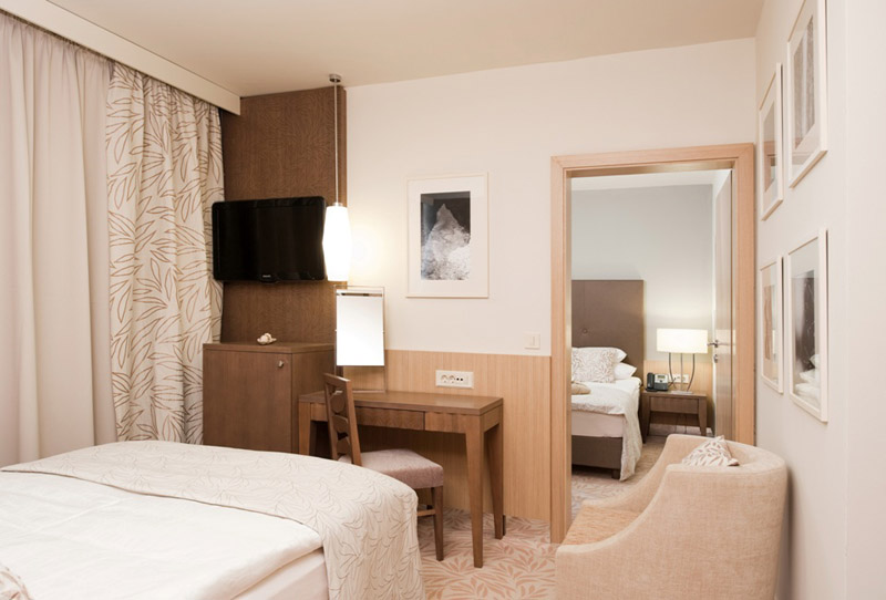 У 2-х кімнатних апартаментах: вітальня з розкладним диваном і спальня, в деяких апартаментах у ванній кімнаті джакузі.