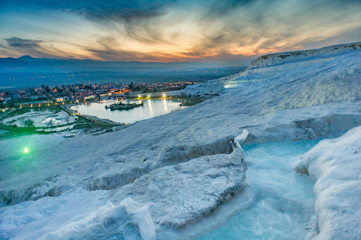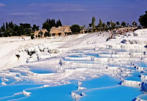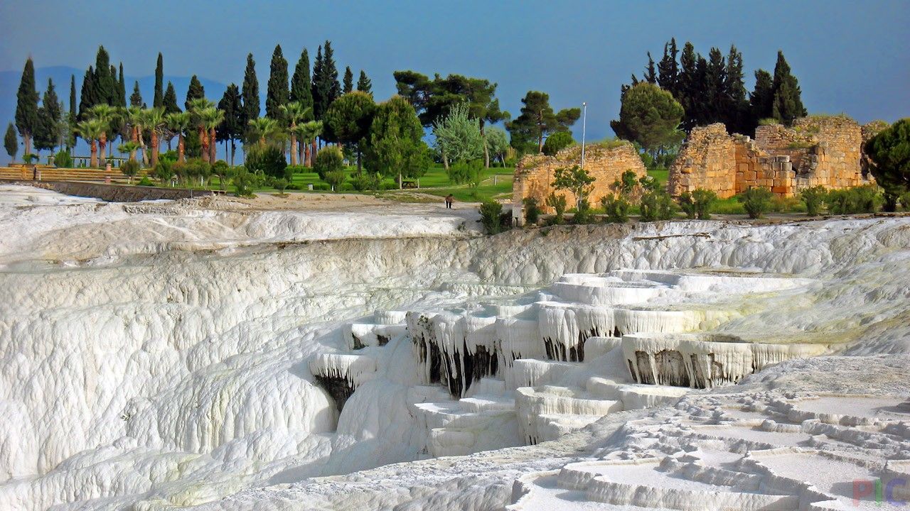 Екзотичним природним ландшафтом Памуккале зобов'язаний дії гарячих джерел, що сприяють утворенню вапняних відкладень на травертинових терасах. Падаючи з висоти, вода століттями створювала скам'янілі білі каскади, що переливаються в променях сонця. Це чарівне видовище і можливість лікування залучають сюди мільйони туристів. Памуккале можна сміливо включити в топ найкрасивіших місць нашої планети.