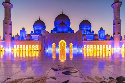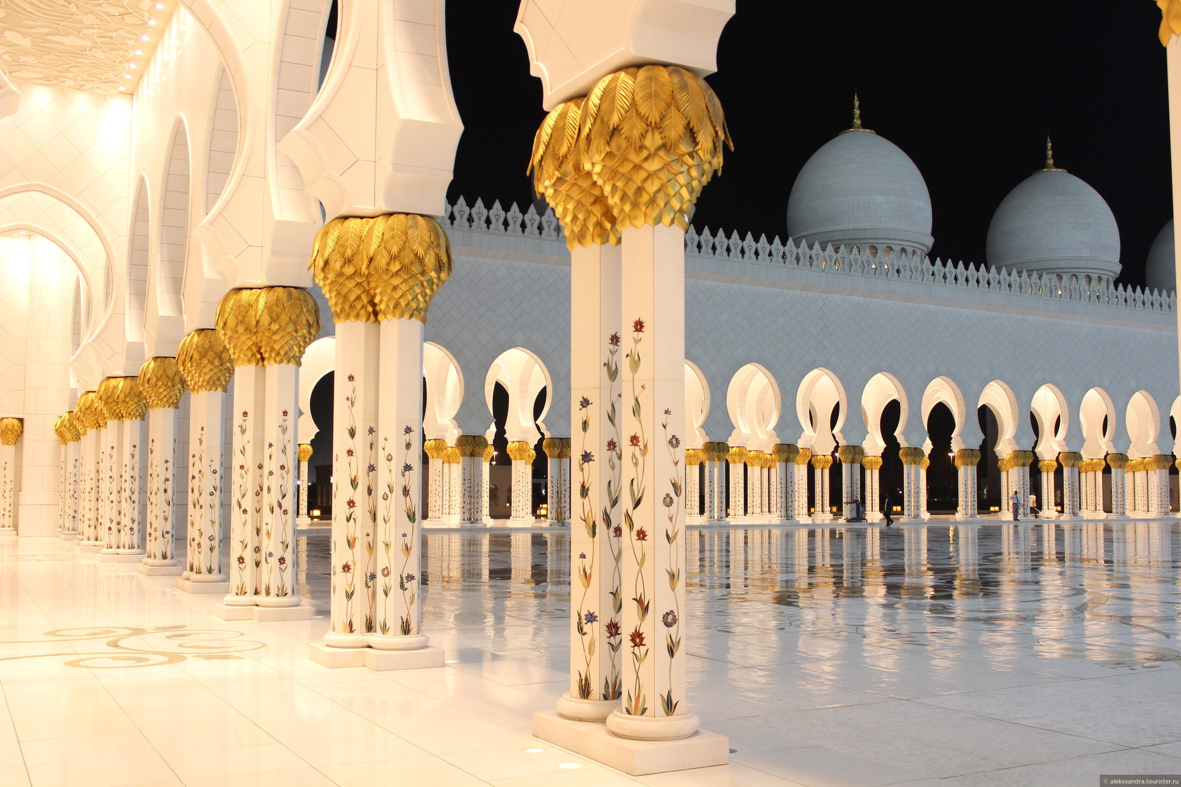 Мечеть займає велику площу - близько 12 гектарів. Велична споруда, вишукана архітектура і блиск золота приваблює тих, хто вдаватися в питання, що відвідати в ОАЕ. Куполи, безліч колон, чотири мінарети висотою понад ста метрів, весь комплекс, оточений квітучими садами, чудово видно з кожного моста, простягнутих від Абу-Дабі до материка (саме місто розташоване на островах). Велика мечеть Зайда на золотому піску феєрично виглядає на тлі світанку або заходу.