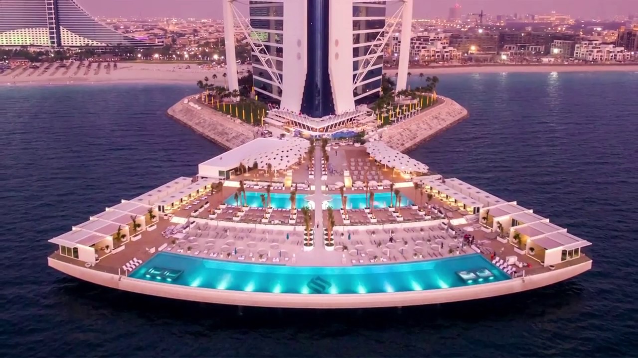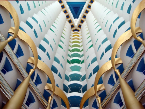 Список найдивовижніших у світі споруд поповнює ще одне унікальне творіння в Дубаї - готель Бурдж аль-Араб, що став справжнім символом міста. Цей розкішний готель у вигляді вітрила морського судна входить в список найдорожчих готелів планети. Рівень його сервісу настільки високий і бездоганний, що в багатьох джерелах Бурдж-ель-Араб згадується як семизірковий готель - насправді, офіційно він належати до категорії п'ятизіркових де люкс. Як приклад, в список послуг готелю входить доставлення з аеропорту на вертольоті, 4 басейни, 2-поверхові номери, команда дворецьких, приватний пляж, релакс-процедури в місцевому спа-центрі та т. п. Внутрішній інтер'єр готелю заснований на контрастах синього і білого кольорів, а також на великій кількості позолочених декорацій. Його вестибюль б'є всі світові рекорди - його висота становить 180 метрів.